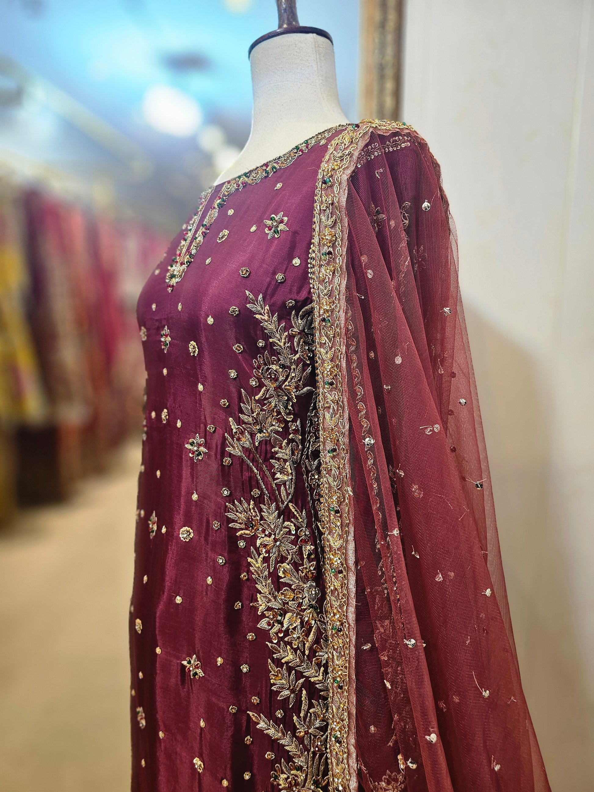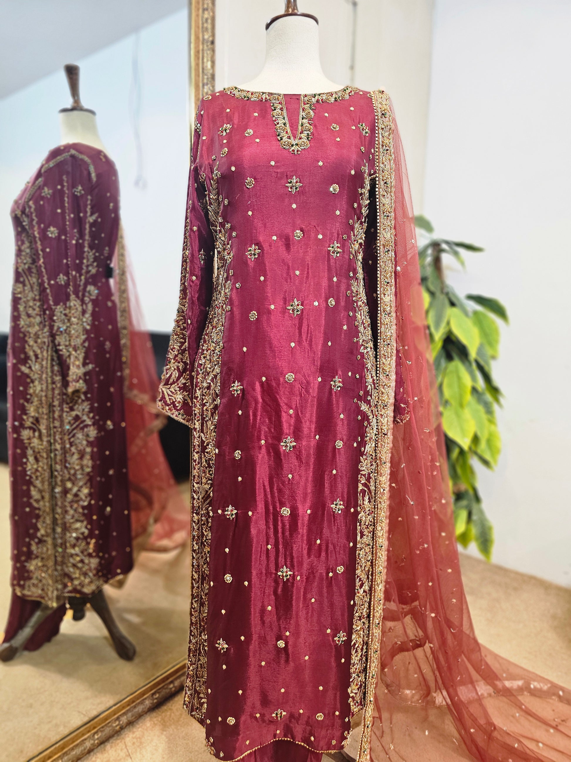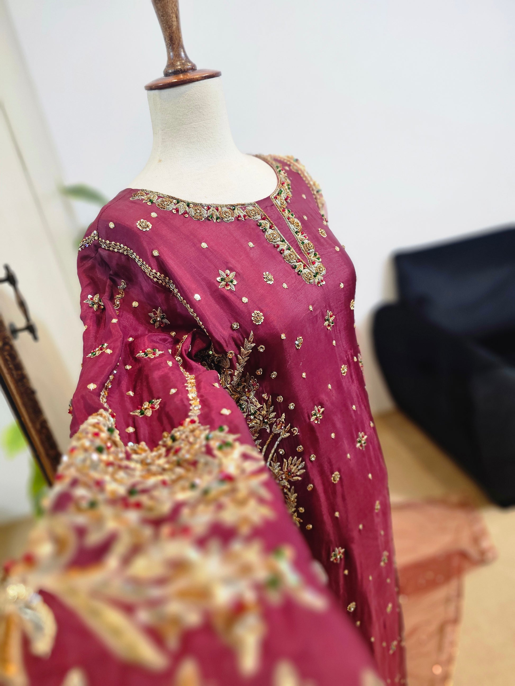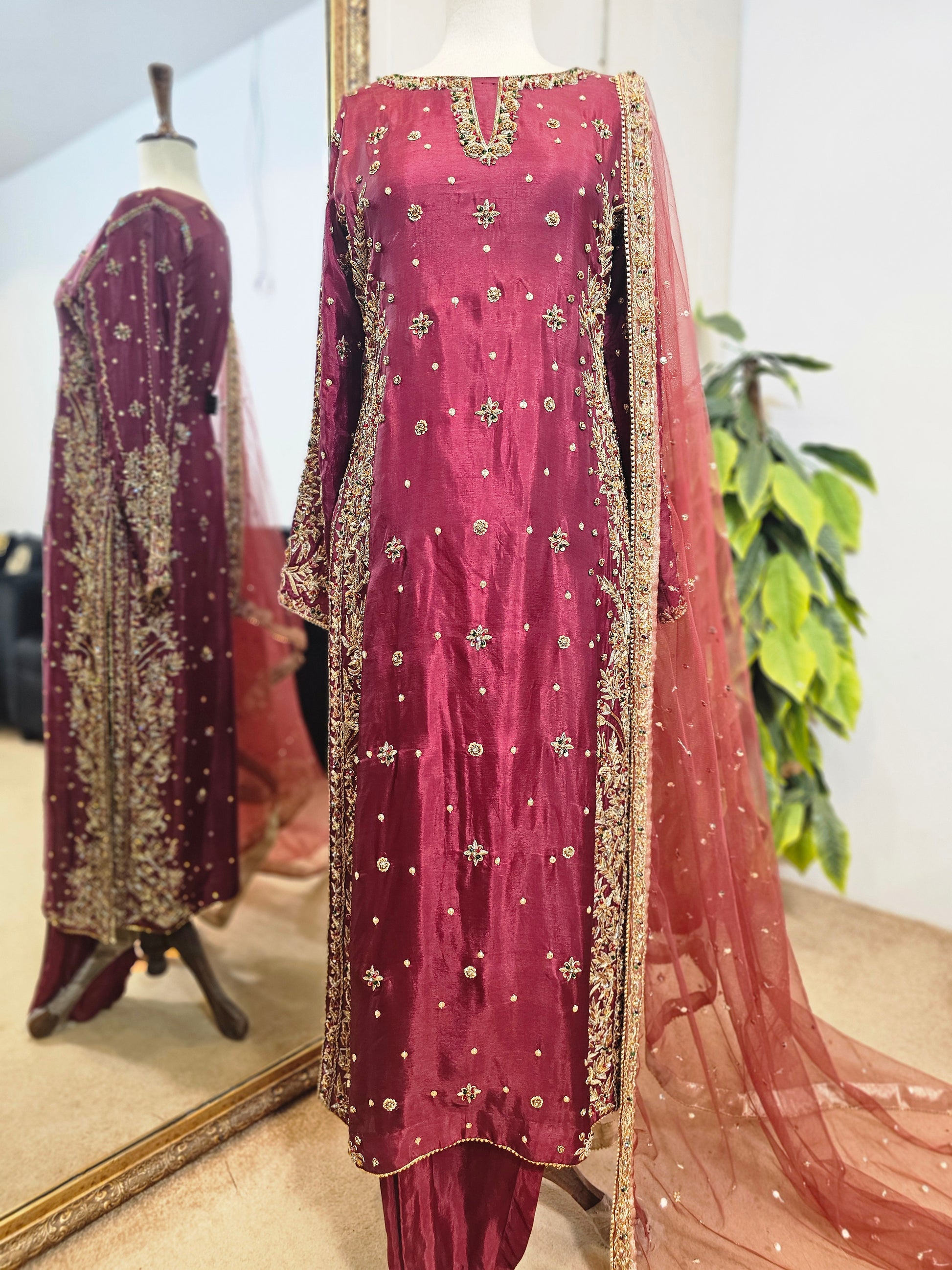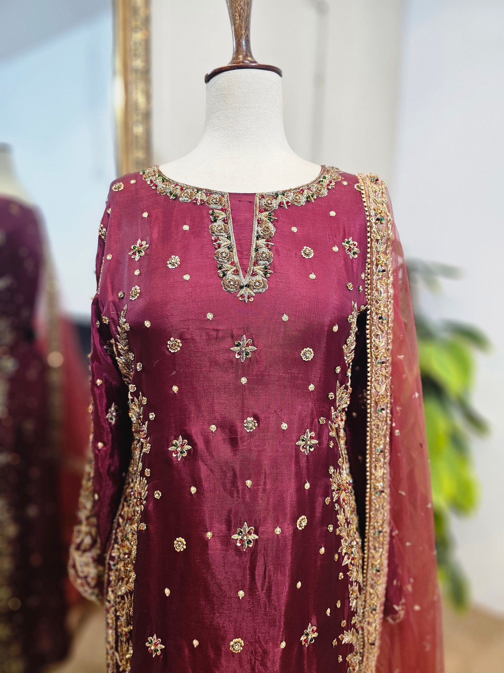 Maroon Shirt & Capri embellished with dabka work customised on tussel silk. Net dopata with one side border embellished with hand work